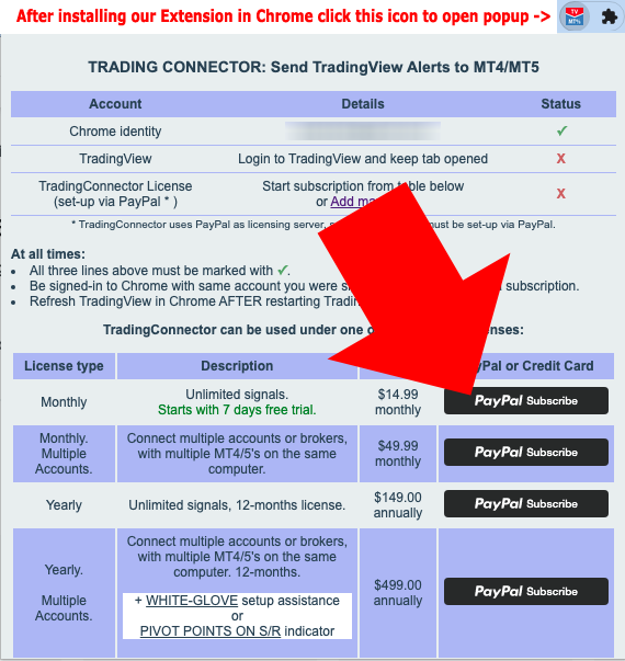 1-c. Click one of 4 black “PayPal Subscribe” buttons to start subscription. You need to be Signed-In to Chrome to launch and use TradingConnector. Without being signed-in to Chrome you won’t even see those black PayPal buttons. Subscribing to “Monthly” plan starts 7-days free trial. Whether you intend to pay with PayPal or just credit card (without setting up PayPal account), we are using PayPal as subscription granting service, also for setting-up free trials, so it all needs to start with these “PayPal Subscribe” buttons. There is no other way.