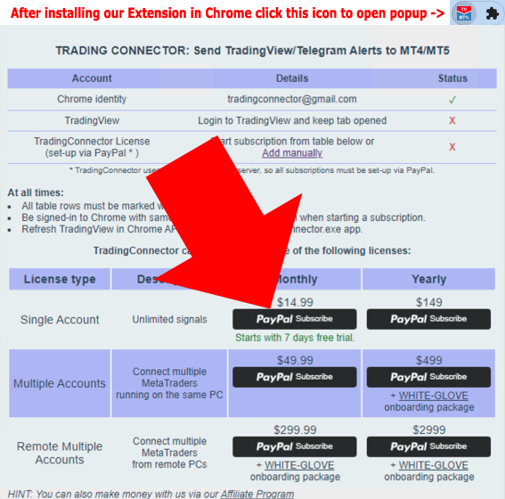 1-c. Click one of 4 black “PayPal Subscribe” buttons to start subscription. You need to be Signed-In to Chrome to launch and use TradingConnector. Without being signed-in to Chrome you won’t even see those black PayPal buttons. Subscribing to “Monthly” plan starts 7-days free trial. Whether you intend to pay with PayPal or just credit card (without setting up PayPal account), we are using PayPal as subscription granting service, also for setting-up free trials, so it all needs to start with these “PayPal Subscribe” buttons. There is no other way.